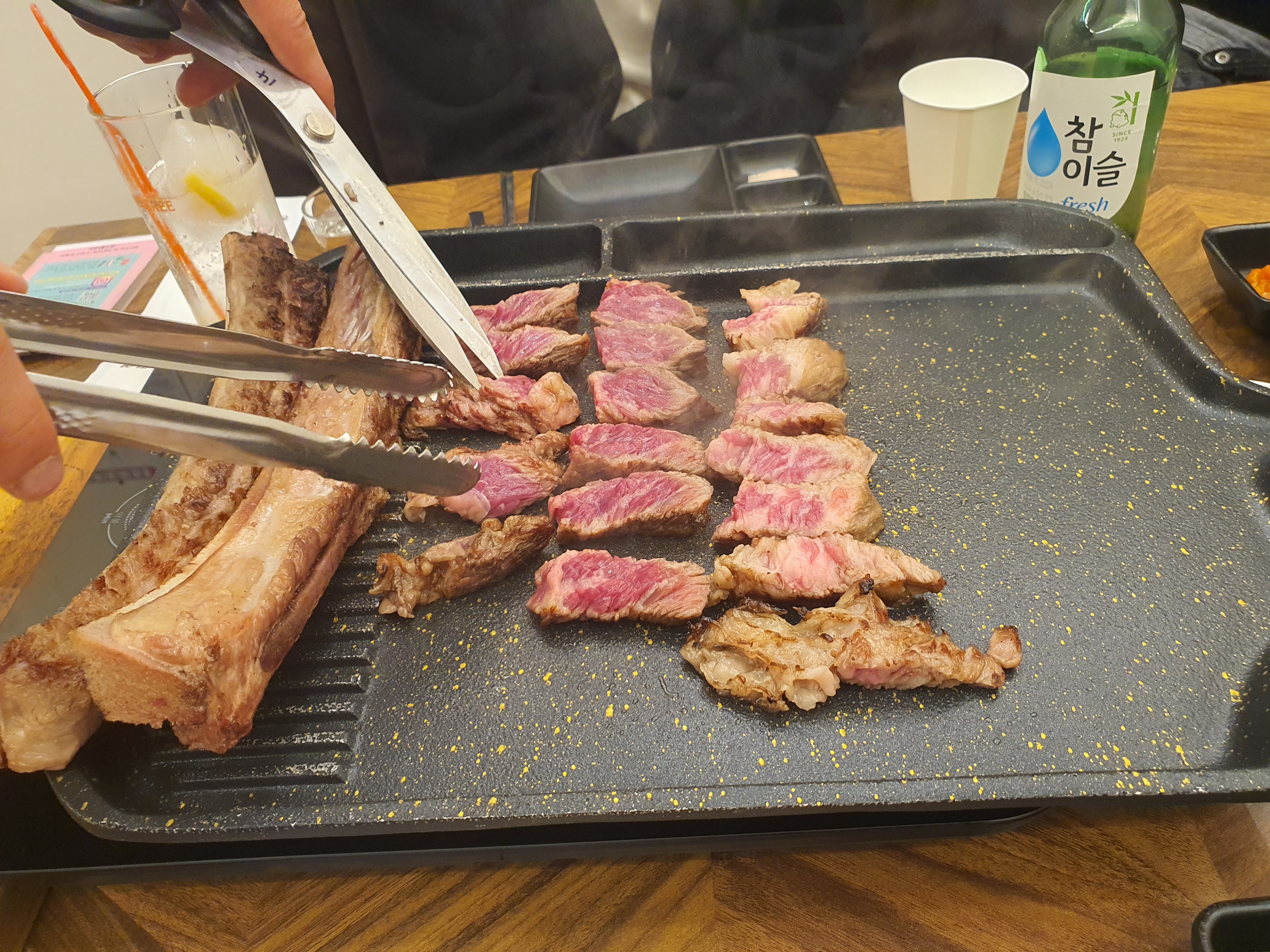갈빗대에 붙은 고기부분을 가위로 분리해 내고 먹기좋은 크기로 잘라서 잘 구워지도록 불판에 배열을 했습니다.